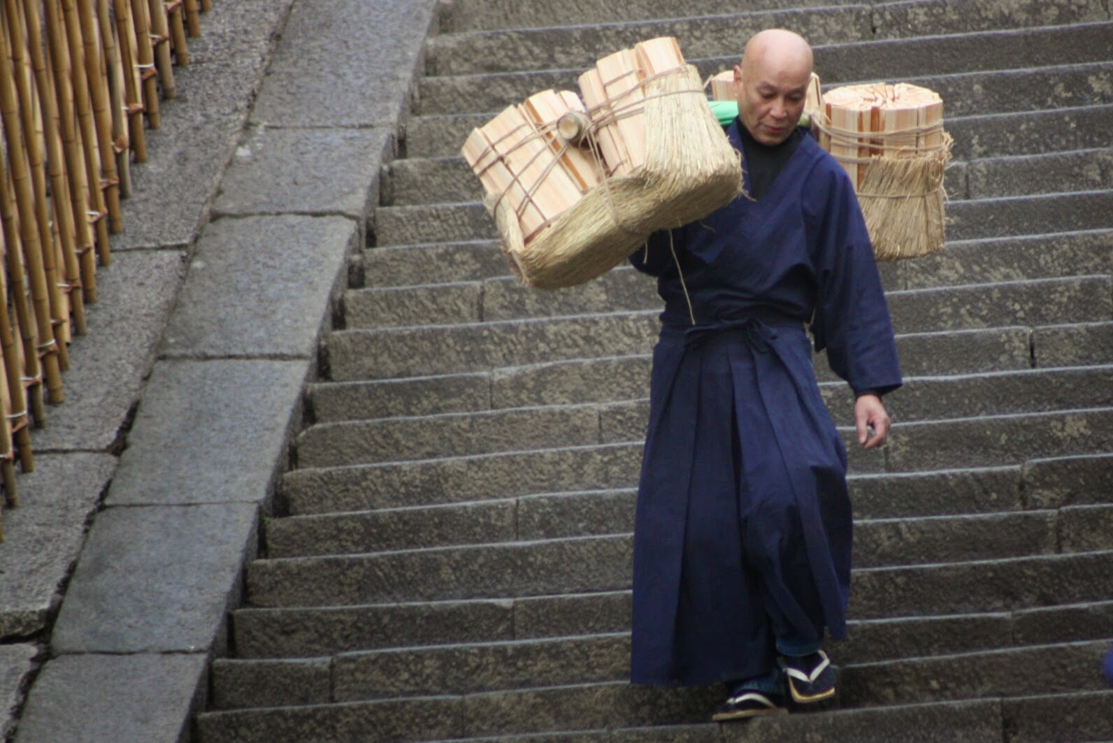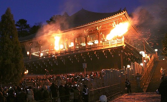 Cada tarde a las 19h los once monjes suben las escaleras al templo Nigatsu-do acompañados de un ayudante. Cada ayudante porta una antorcha de fuego gigante para dar luz al camino del templo. Cada antorcha está hecha de una vara larga de bambú que pesa 40 kg y mide 8 m. de largo con ramas de cedro atadas en la punta.