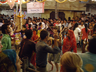 Llegamos a Udaipur, 250 Km, en 5 horasDejamos nuestras mochilas en el Hotel Minerva (500 Rp/noche en habitación doble) y salimos a ver que nos ofrecía esta ciudad y… Wala… ¡¡SORPRESAAA!! ¡¡FIESTAAAAA!! Durga Puja, festival que dura 9 días, bueno, eso creemos porque indio que preguntábamos, indio que nos decía una cosa distinta, en cualquier caso disfrutamos de ella todo lo que nuestro cuerpo aguantó.
