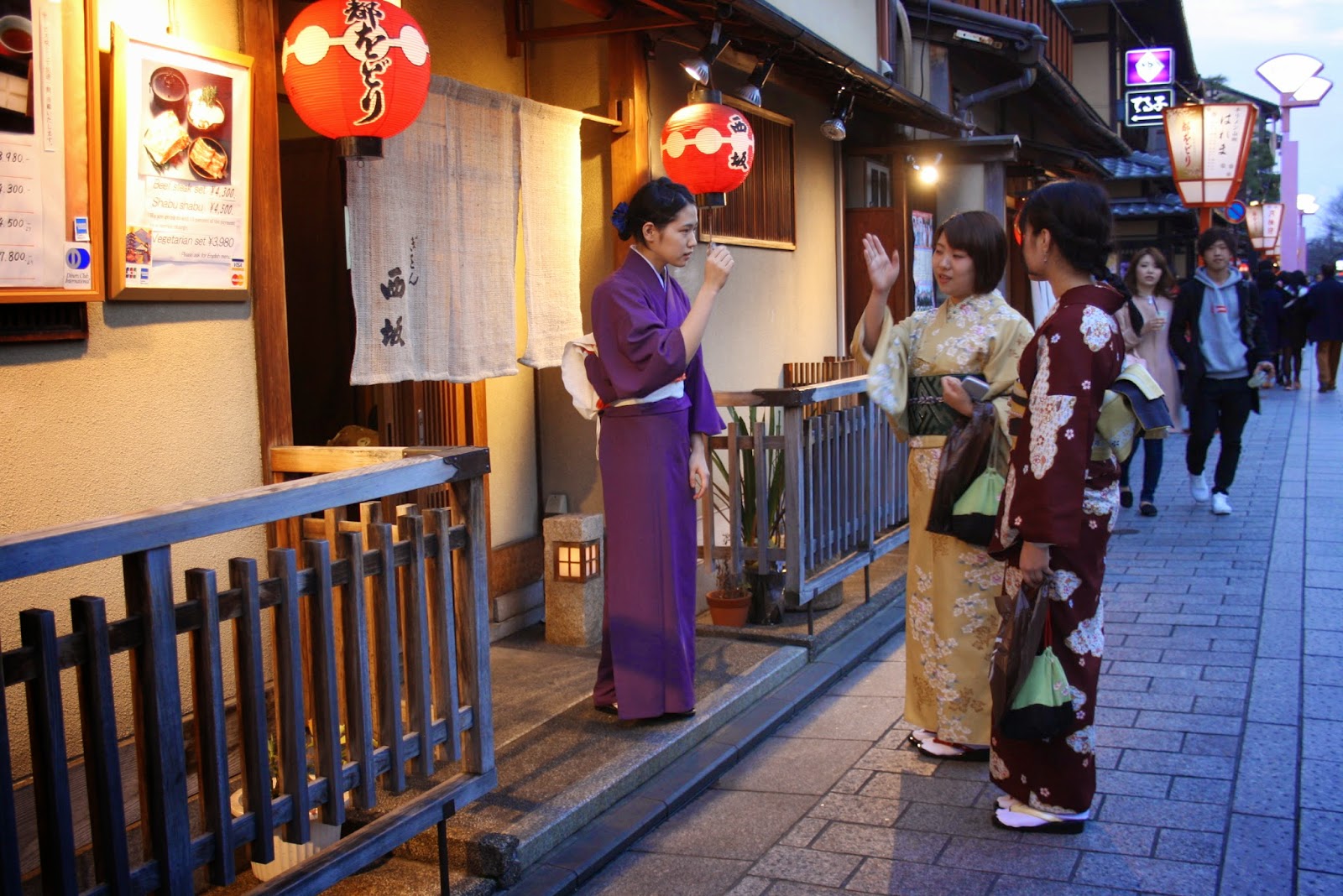 Contentas de haber estado en la graduación (un ratito) volvemos a Kyoto donde es muy buena hora para pasear por Gion e Higashiyama. Entre las 17:30 Y 18:00 es cuando recogen a las Geishas para ir a cenar.