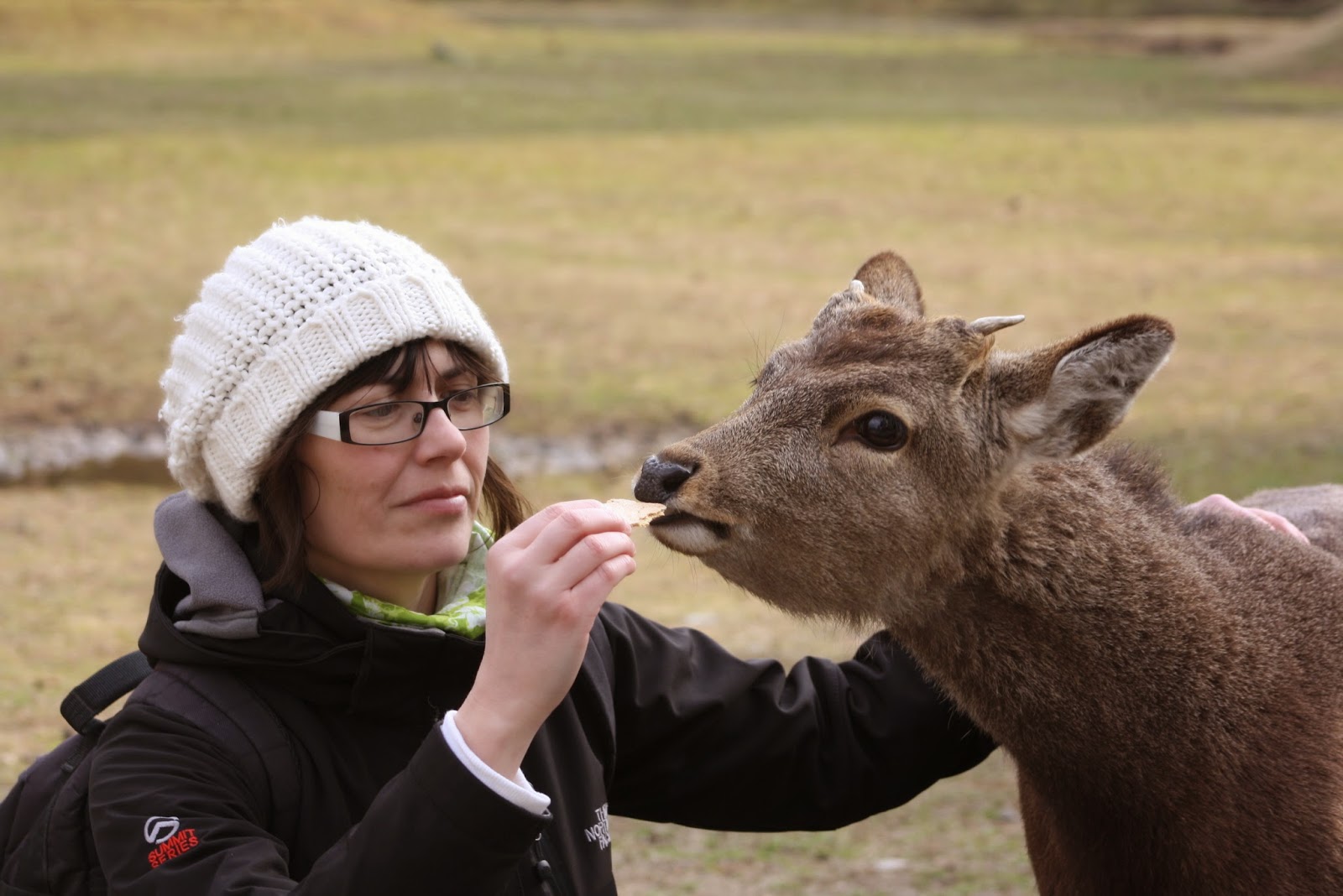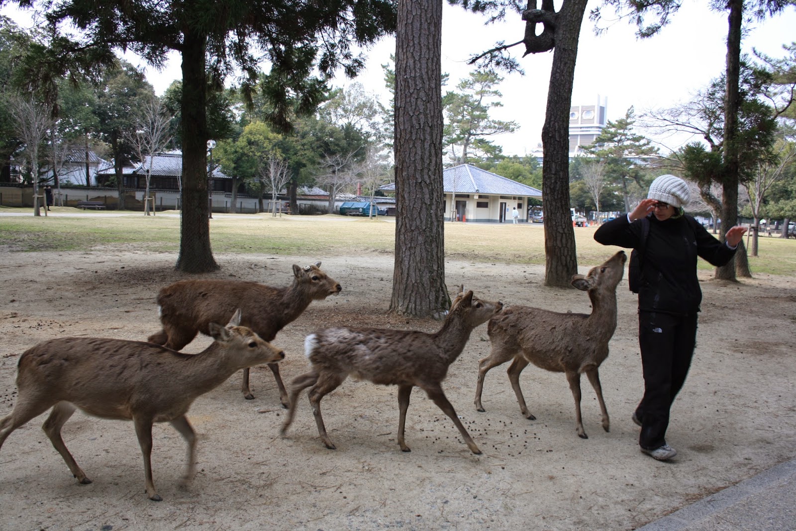 Ponemos rumbo a Nara (38 minutos). Después de una larga caminata llegamos al parque donde nos reciben un montón de ciervos con mucho hambre, les compramos unas galletitas para ciervos (150¥) y… ya veis el resultado en la foto… les das una galleta y te quieren comer hasta la mochila.
