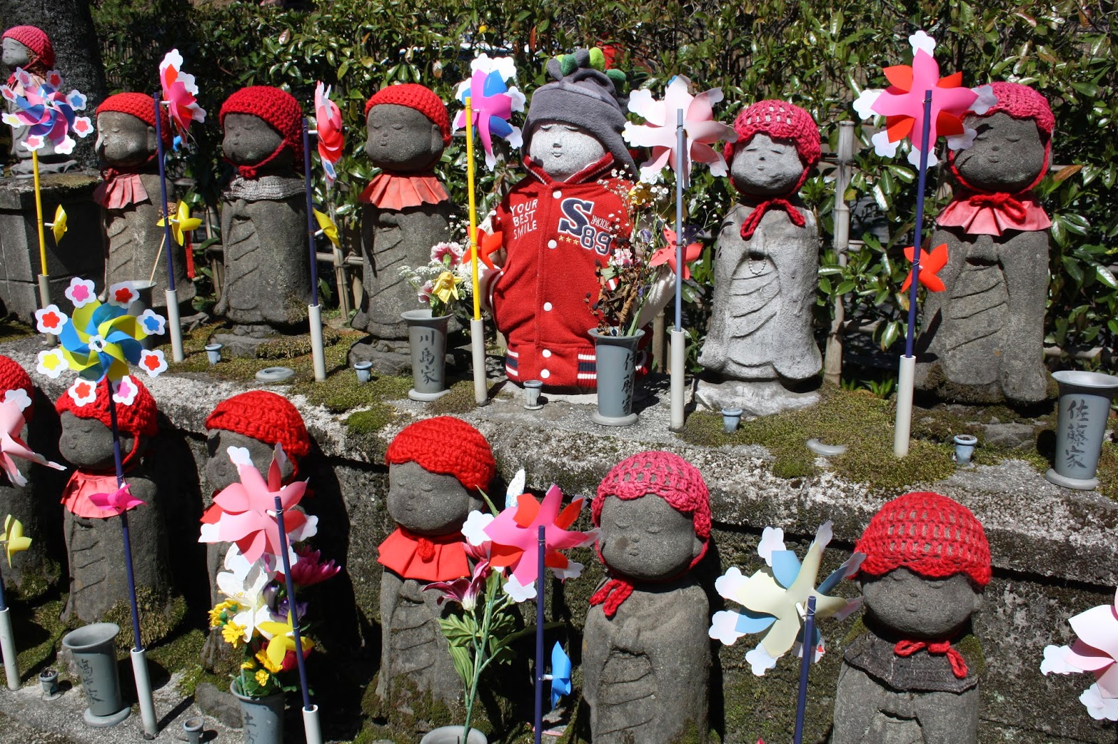 Fuera del templo en el lateral derecho se encuentran largas filas de estas estatuas vestidas de color rojo. Cada una con su molinillo de viento. Es el cementerio de estatuas Jizo, que representan a un niño muerto o no nacido. Estas tumbas estan representadas con estatuas de Jizo: la deidad más venerada en Japón, dios encargado de proteger el alma de los niños que aún no han nacido, de los que han muerto siendo muy pequeños, de las embarazadas y, curiosamente, de los bomberos y de los viajeros.