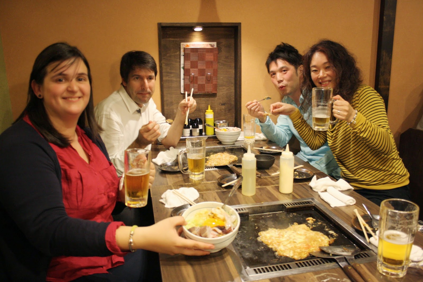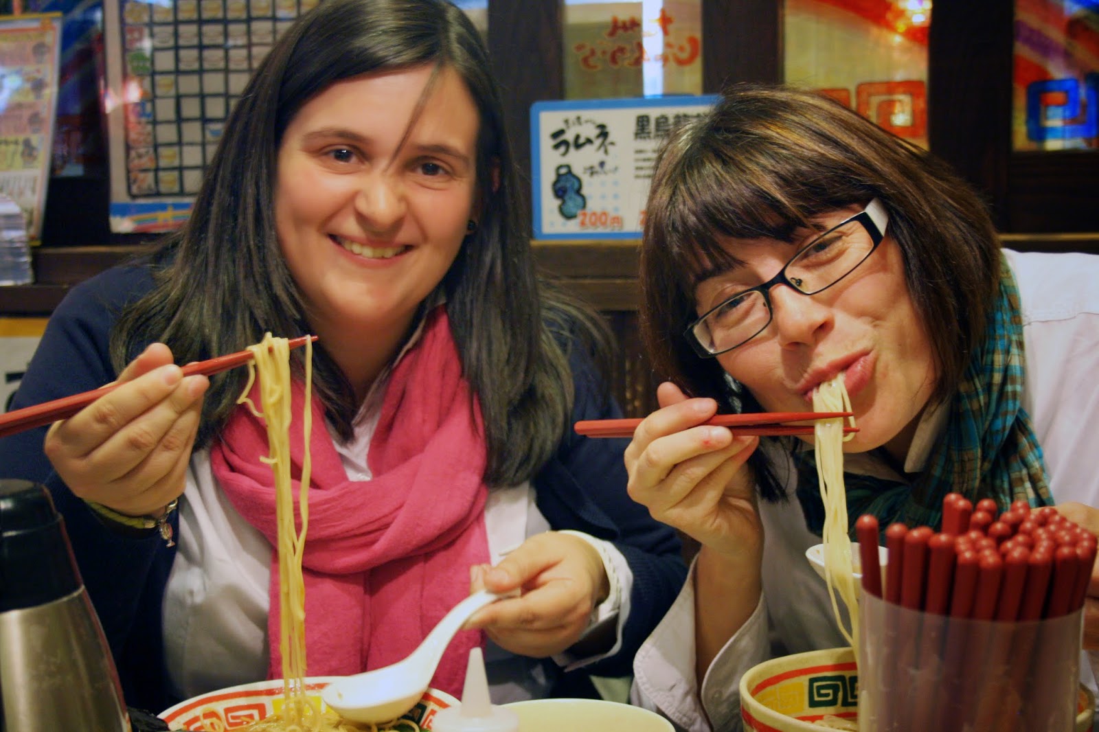 Cenamos con nuestros amigos japoneses, Yasuko y Satoro, como no podía ser de otra manera nos llevan a probar platos típicos japoneses, que por cierto estaban buenísimos. Esta vez probamos ramen (Es la versión japonesa de la sopa de fideos chinos). Sopa que se come con palillos ayudándote de una cuchara. Nuestros nuevos amigos se lo pasaron pipa viéndonos el sobre esfuerzo que hacíamos para comernos aquella sopa con fideos a la vez que sorbíamos con fuerza para hacer mucho ruido (esto está bien visto en Japón).
