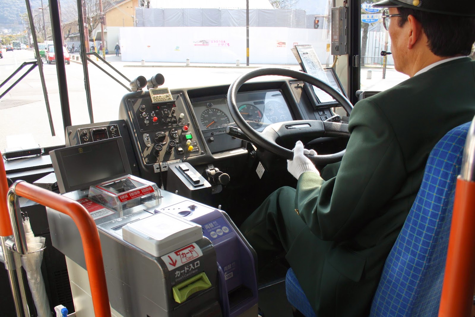 Hoy recorreremos los puntos de interés de Kyoto en bus. Se sube por la puerta trasera y se baja por la delantera, en el momento de bajar es cuando se paga. Hay dos opciones para pagar, una es en efectivo (se echa el dinero en una especie de embudo al lado del conductor y la máquina lo cuenta sola), y otra con la tarjeta de día que se compra en el mismo autobús (se activa en el primer viaje y el resto de viajes sólo hay que enseñársela al conductor al bajar).