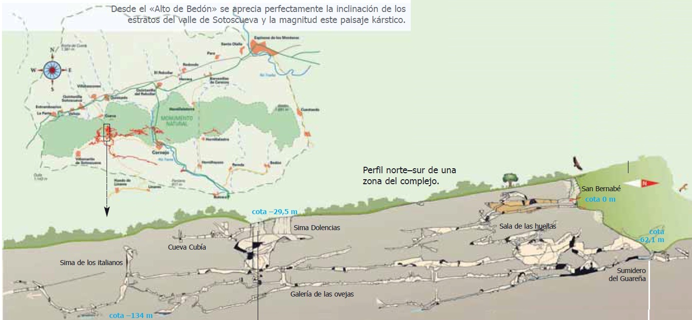 El complejo kárstico está formado por más de 110km de galerías, divididas en seis niveles, de los cuales sólo se pueden visitar 400m y la ermita dedicada a San Bernabé.
